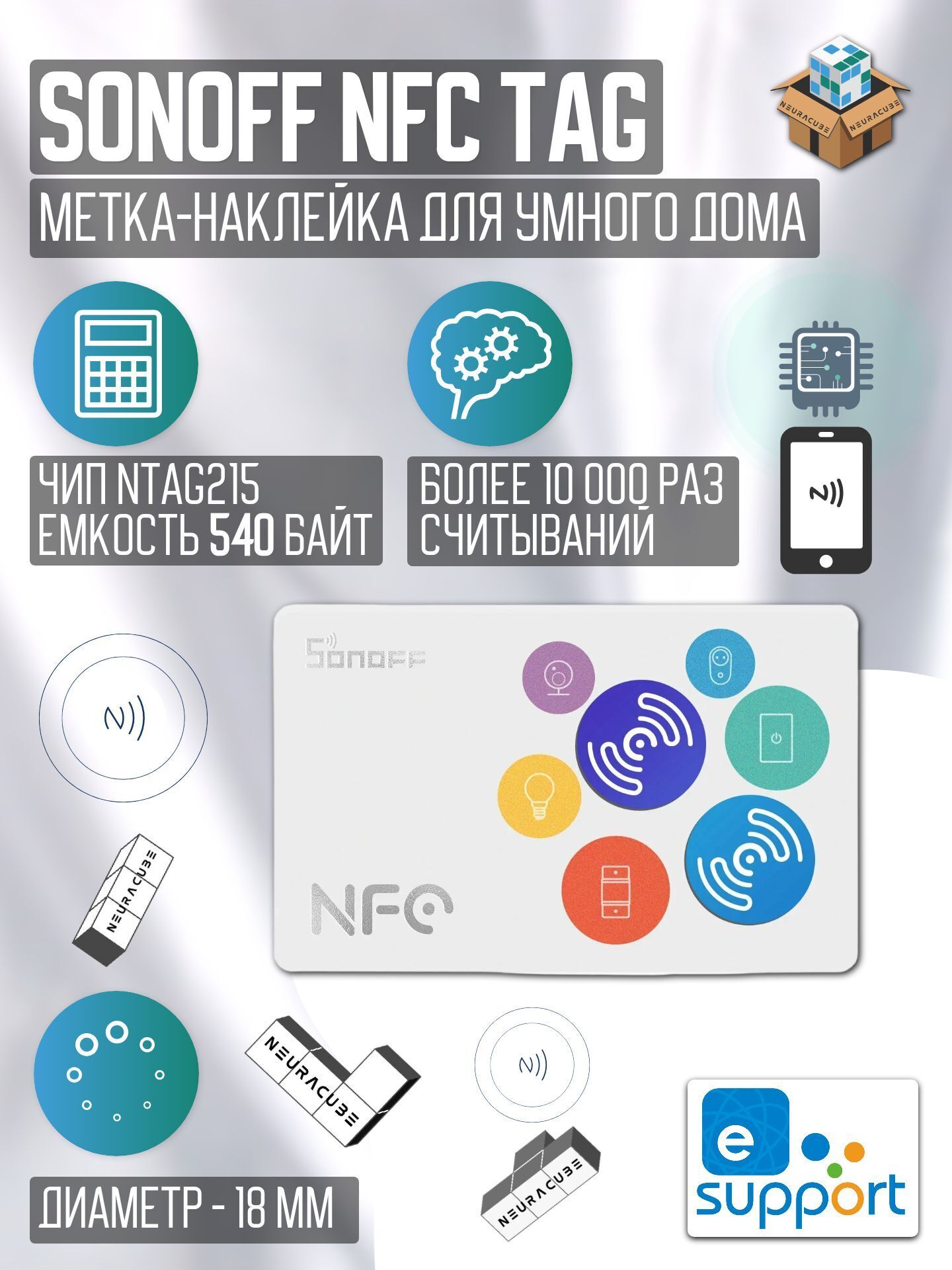 Sonoff NFC Tag — это компактная пассивная NFC-метка с чипом NTAG215 и встроенной памятью 540 байт, предназначенная для запуска сценариев в системе Sonoff / eWeLink. Просто коснитесь метки смартфоном — и активируйте любое умное действие: включите свет, запустите «вечерний режим», откройте шторы или включите музыку.