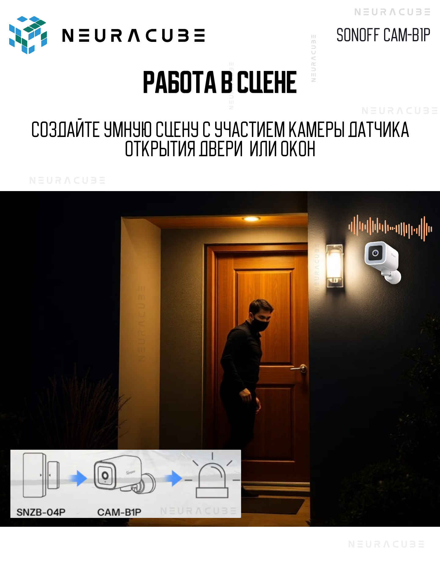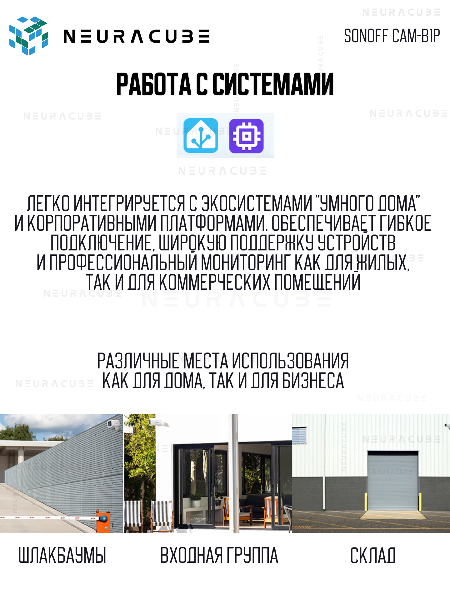 Камера легко интегрируется в экосистему умного дома. Используйте RTSP-поток для просмотра видео на компьютере или сторонних панелях управления. Благодаря прочному корпусу и защите от внешних факторов, SONOFF CAM-B1P станет вашим надежным охранником в любое время года.