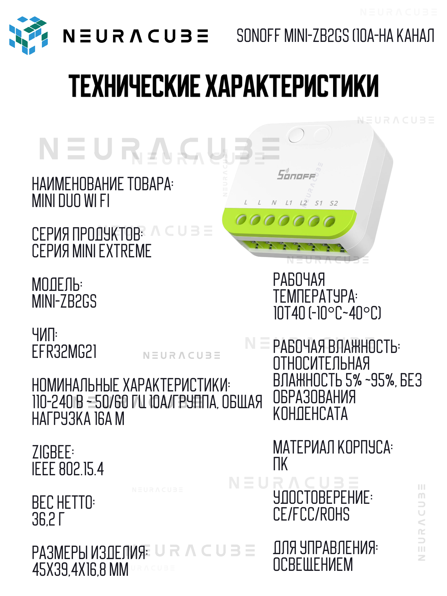 📍 Модель: MINI-ZB2GS 📍 Тип связи: Zigbee 3.0 (требуется шлюз) 📍 Количество каналов: 2 (независимое управление) 📍 Входное напряжение: 100-240V AC 50/60Hz 📍 Максимальный ток: 16A (всего) / 10A на канал 📍 Материал: Огнестойкий поликарбонат (PC V0) 📍 Размер: Компактный форм-фактор для внутренней установки