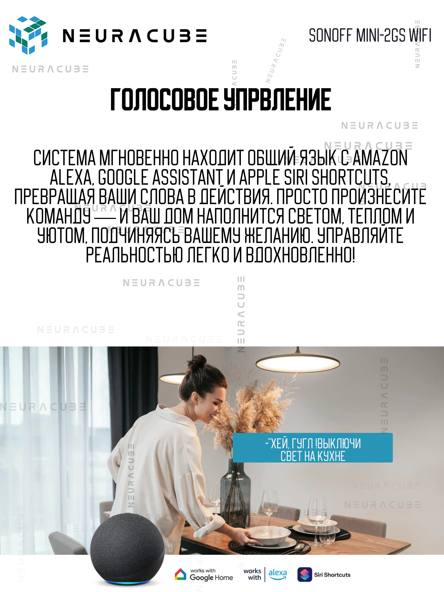 🔹 Голосовое управление: Полная интеграция с Яндекс Алисой, Google Assistant и Amazon Alexa. Просто скажите: «Алиса, выключи свет на кухне».
